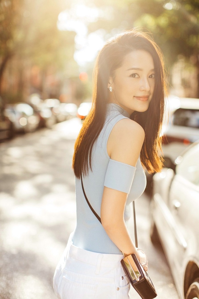 李沁春日漫步笑靥如花 雾霾蓝穿搭点亮街头